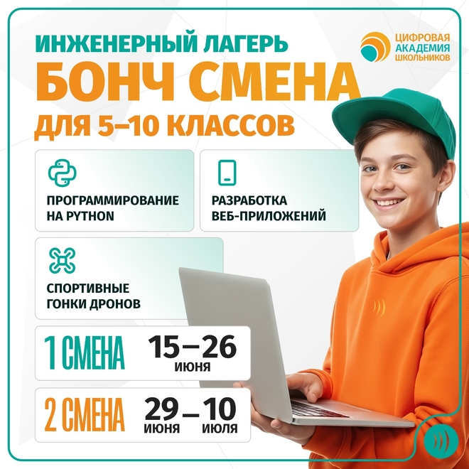 Инженерный лагерь «Бонч Смена» СПбГУТ – это интенсивная очная программа, которая позволит школьникам на две недели погрузиться в мир информационных технологий, получить практические навыки программирования и попробовать себя в различных профессиях.