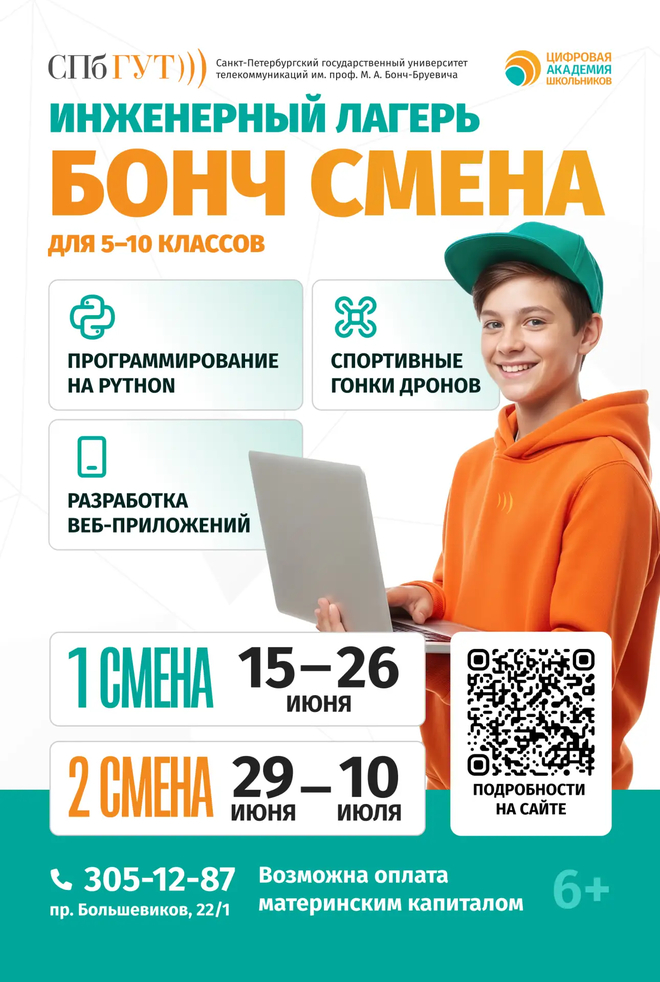 Инженерный лагерь «Бонч Смена» СПбГУТ – это интенсивная очная программа, которая позволит школьникам на две недели погрузиться в мир информационных технологий, получить практические навыки программирования и попробовать себя в различных профессиях.