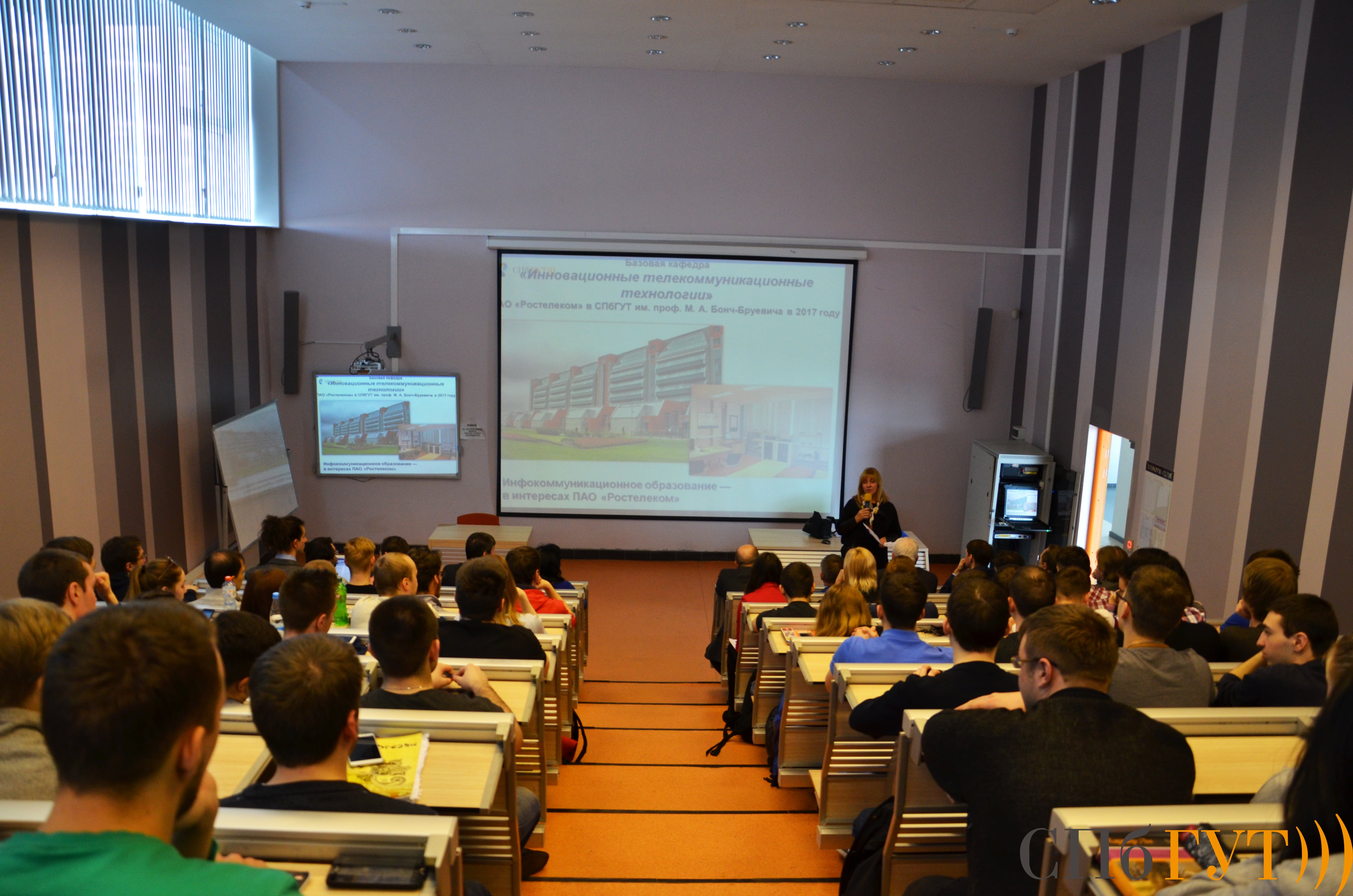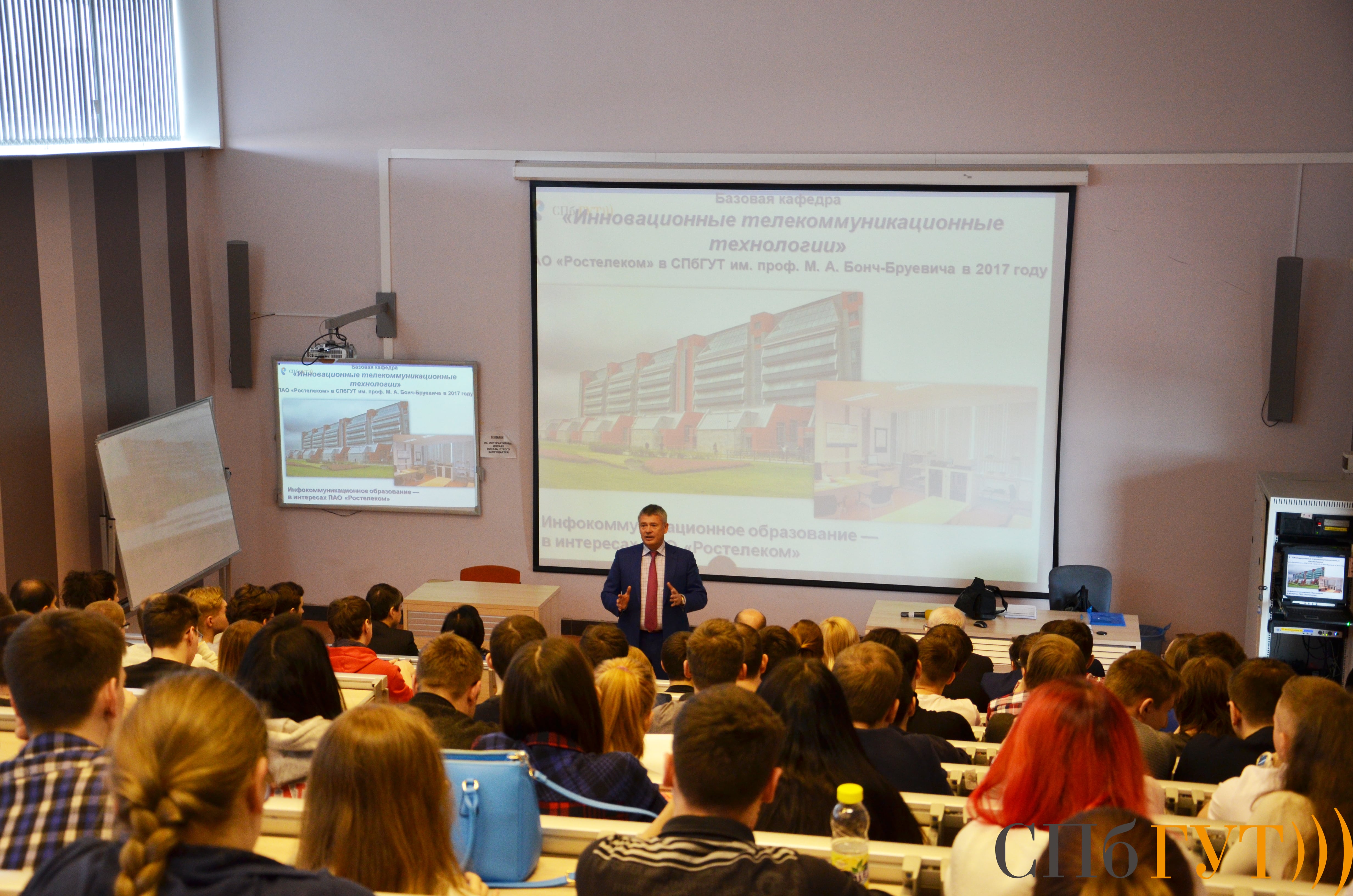 В СПбГУТ стартовал новый конкурсный отбор на базовую кафедру «Ростелекома». 19 апреля в Санкт-Петербургском государственном университете телекоммуникаций (СПбГУТ) им. Бонч-Бруевича состоялась установочная встреча руководства макрорегионального филиала «Северо-Запад», посвященная работе базовой кафедре «Инновационные технологии телекоммуникаций». Ведущей мероприятия выступила директор по организационному развитию МРФ «Северо-Запад» Ирина Тамбовская. Открыли встречу Вице-президент — Директор макрорегионального филиала «Северо-Запад», заведующий кафедрой Андрей Балаценко и ректор СПбГУТ Сергей Бачевский. Далее с подробной презентацией о кафедре «Ростелекома» и об особенностях обучения рассказал заведующий кафедрой инфокоммуникационных систем Борис Гольдштейн.
