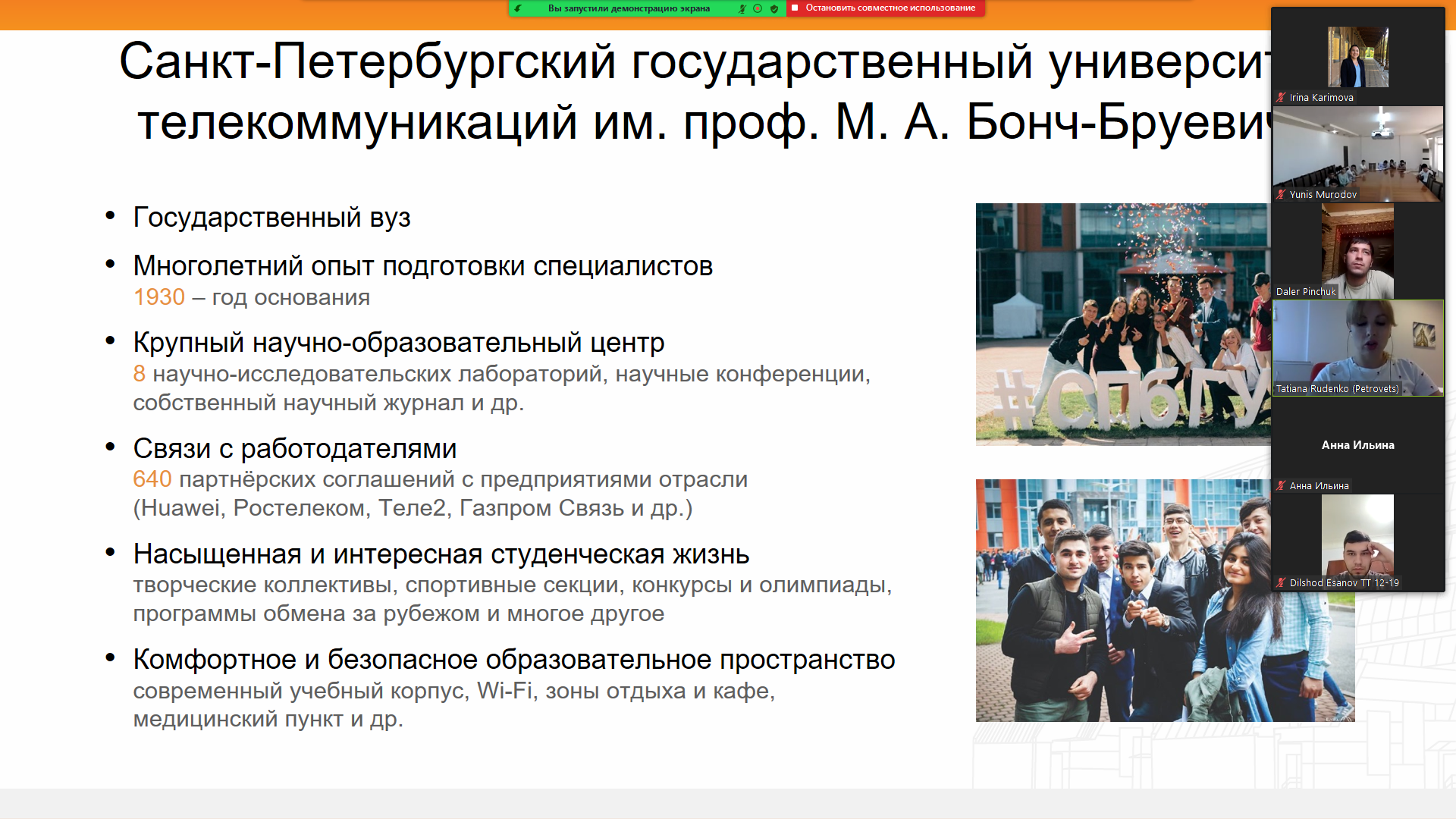 Irina Karimova made presentation of the University, informed about conditions for admission to the main educational programs of SPbSUT. Students received detailed information about exchange programs, extracurricular activities of the University and accommodation in dormitories. Colleagues and students asked questions about education, transfer of disciplines at home University during the meeting.