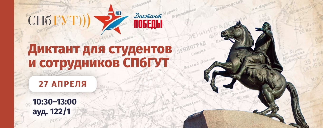 Диктант состоится 27 апреля с 10:30 до 13:00 в главном корпусе СПбГУТ (пр. Большевиков, 22/1, ауд. 122/1).