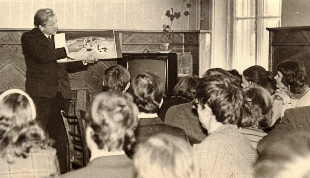 8—9 — Ректор Ю. П. Куликовский показывает фото макета нового комплекса института, 1977
