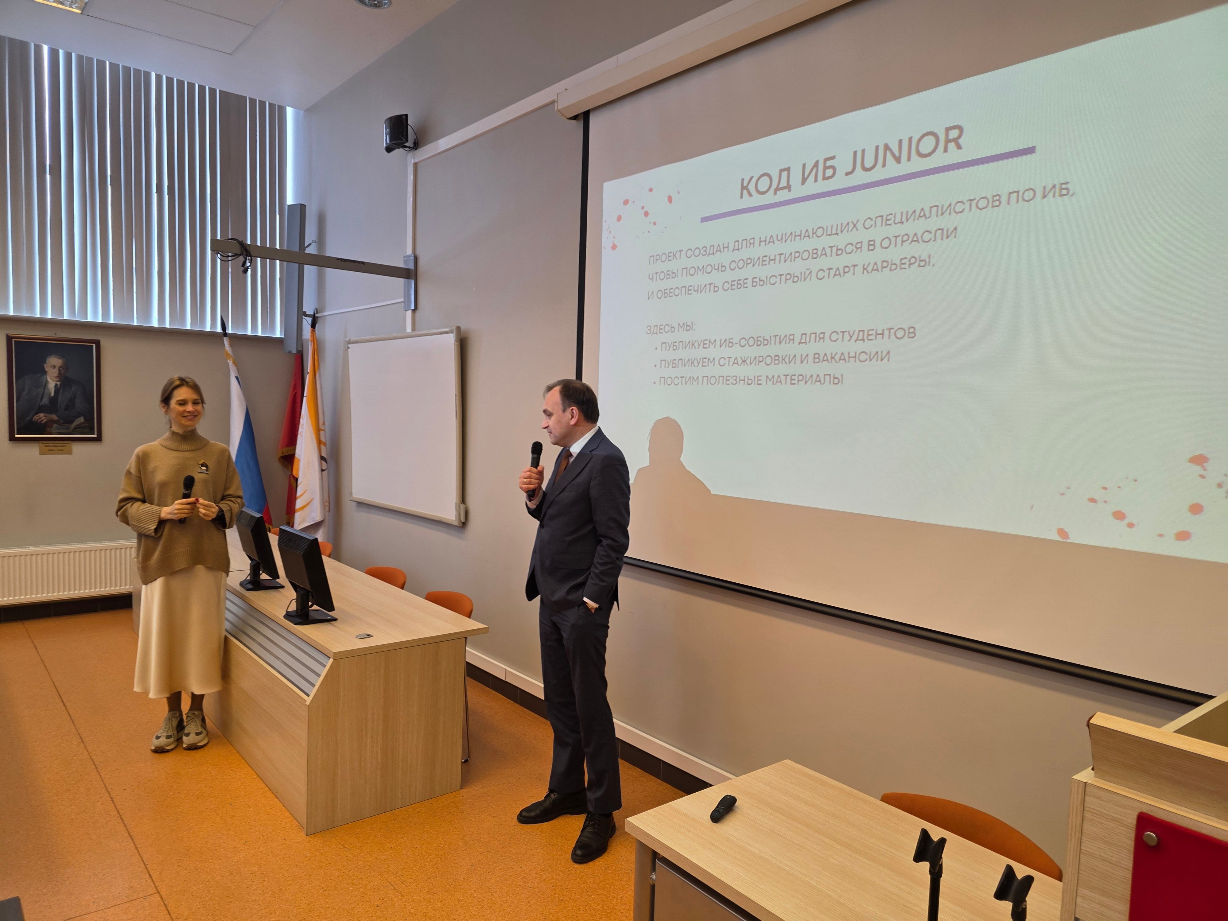 CEO и продюсер проекта «КОД ИБ» Ольга Поздняк выступила с презентацией и познакомила студентов с направлениями работы в области ИБ. Она же провела деловую игру.