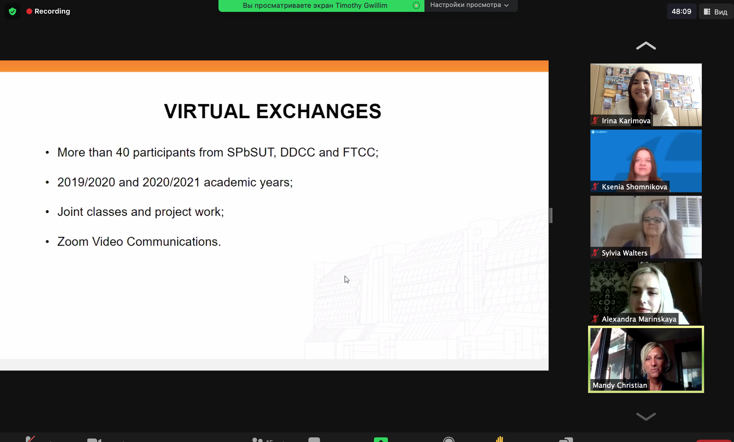 Тимати Гвиллим продемонстрировал результаты проведенного среди участников совместной программы опроса, которые подтвердили положительную оценку организованного обмена. В презентации были также представлены награды, которые получил проект: EEUA Award 2021 и NAFSA 2021 Senator Paul Simon Award for Campus Internationalization.