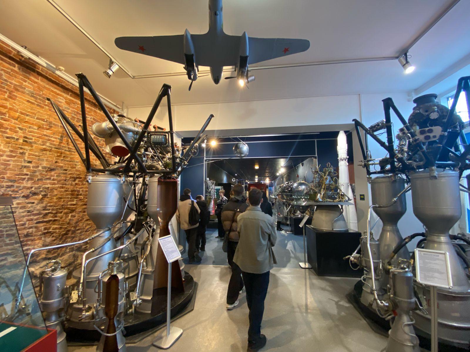 На экспозиции ребята познакомились с уникальными разработками конструкторов лаборатории: ракетами на бездымном порохе (впоследствии использовались в минометной установке БМ-13, так называемой «катюше»), жидкостными ракетными двигателями и их прямыми потомками — маршевыми двигателями космических ракет.
