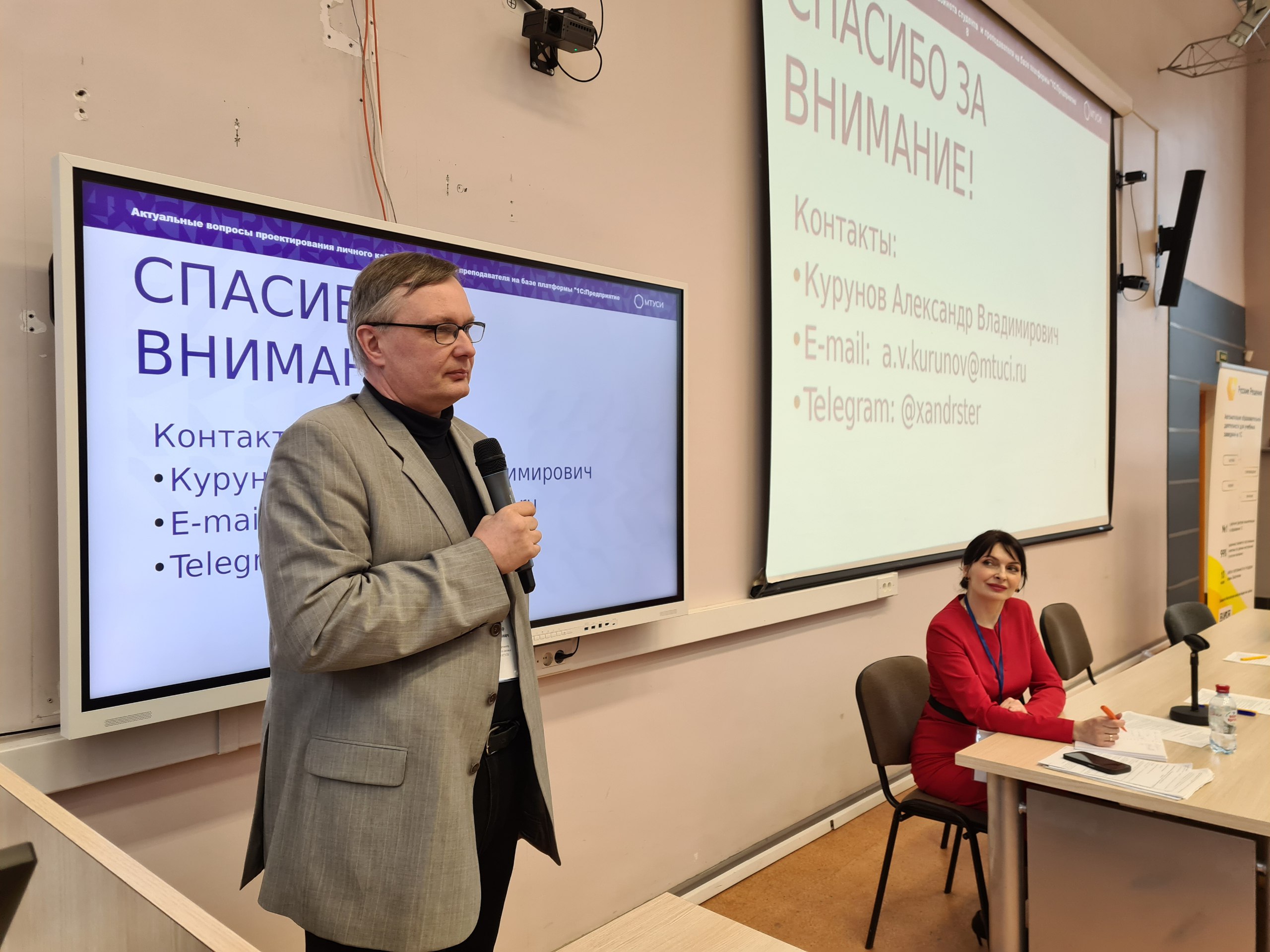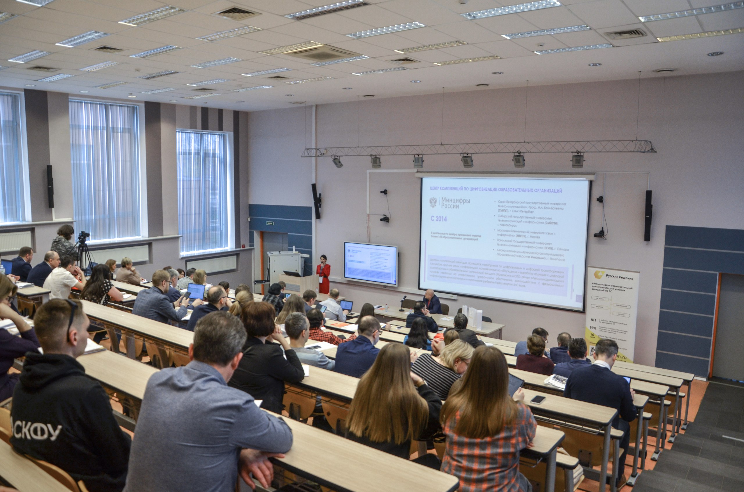Модерировали секцию ВПО круглого стола начальник отдела развития и внедрения информационных систем Пацкан Максим Юрьевич и начальник управления информационных технологий Сибирского государственного университета телекоммуникаций и информатики Арифуллина Светлана Борисовна.