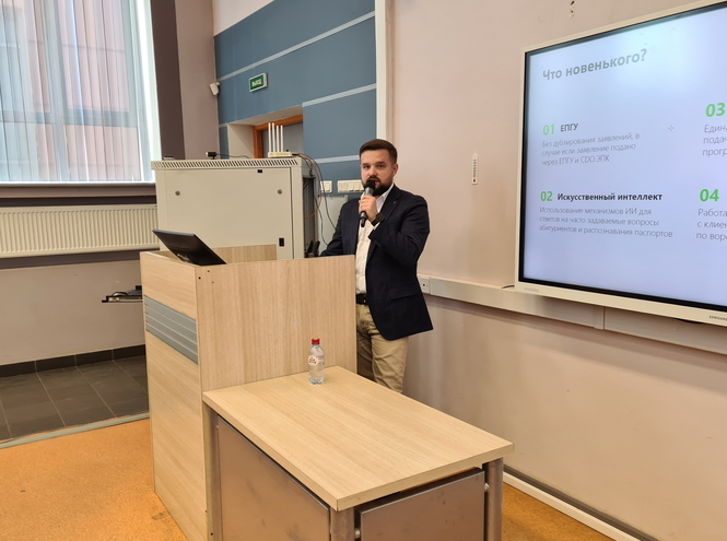 О подготовке к приемной кампании 2024 рассказала Евгения Робертовна Рахматуллина, начальник отдела автоматизированных систем управления. Так же в теме доклада был поднят вопрос о подсистеме модератора для разбора входящих заявлений через ЕПГУ.