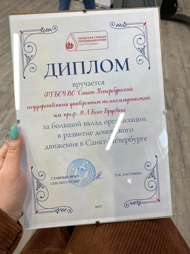 15 апреля 2022 года нашему университету был вручен диплом "За большой вклад организации в развитие донорского движения в Санкт-Петербурге".