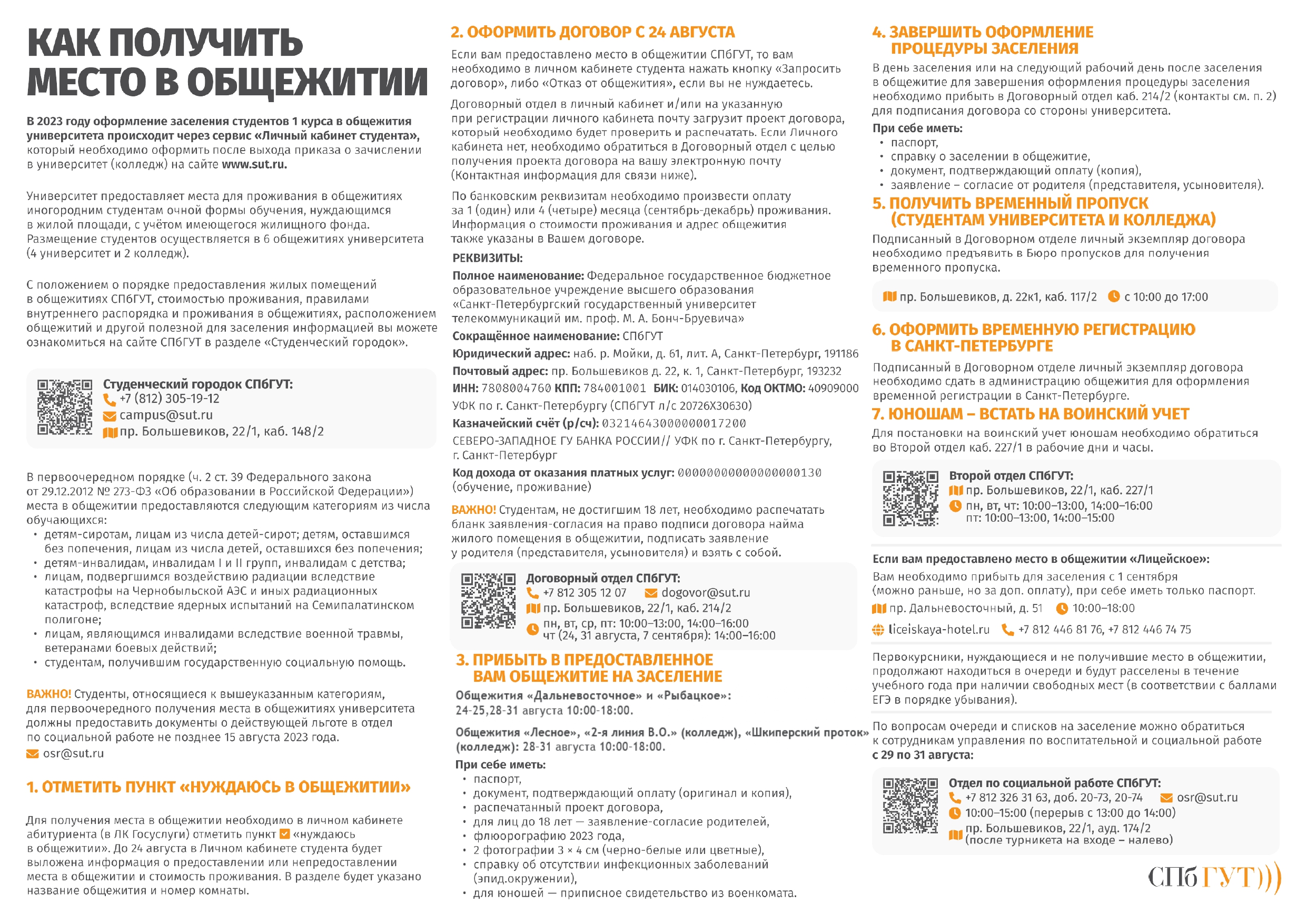 Студенческий городок СПбГУТ включает в себя 6 общежитий в разных районах города (4 общежития для студентов университета, 2 общежития для студентов колледжа). Время на дорогу до университета составляет в пределах часа.